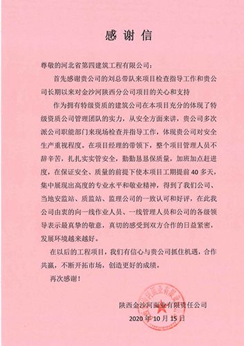 業(yè)主單位陜西金沙河面業(yè)有限責任公司在感謝信中,對公司管理團隊的專業(yè)水平和綜合實力給予了充分肯定,表達了今后與公司深化合作的意愿。來自不同單位的錦旗上,分別寫著“服務至上 誠信履約”“創(chuàng)精品工程 展鐵軍風采”“技術(shù)創(chuàng)新 高質(zhì)高量”,充分體現(xiàn)了對公司管理團隊誠信守責、真抓實干、技術(shù)過硬、能打勝仗工作作風的一致肯定。